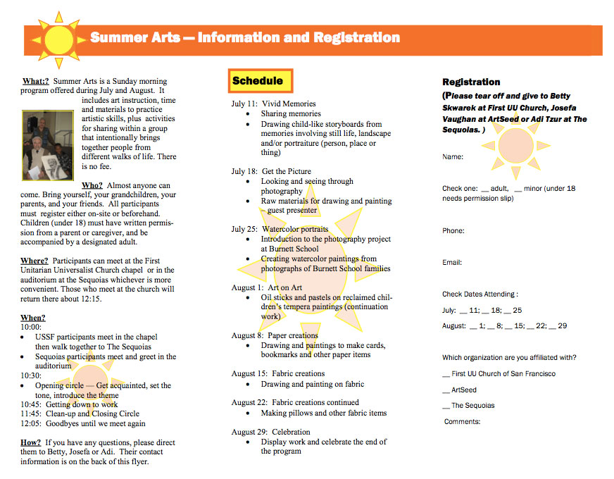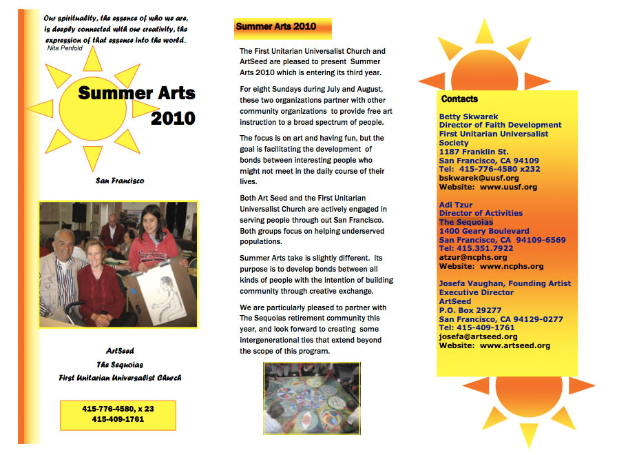 ArtSeed’s FREE Sunday morning classes at the Sequoias in Japan town start July 11. Please confirm your interest in joining us as a student or volunteer artist after checking out the brochure below. To confirm, email or call us at 415-409-1761.