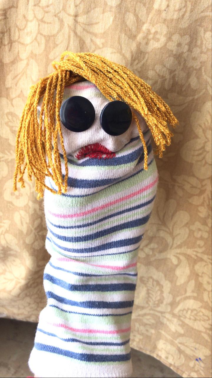 Mara Moreno Gonzalez, Sock Puppet Published August 25, 2020 at 720 × 1280 in Gallery Room 3: “Only Zombies Race to Mass Extinction!” Artist: Mara Moreno Gonzalez Size: Variable Medium: Sock, yarn, buttons and thread Date: July 2020 Title: “Sock Puppet” Retail value: NFS