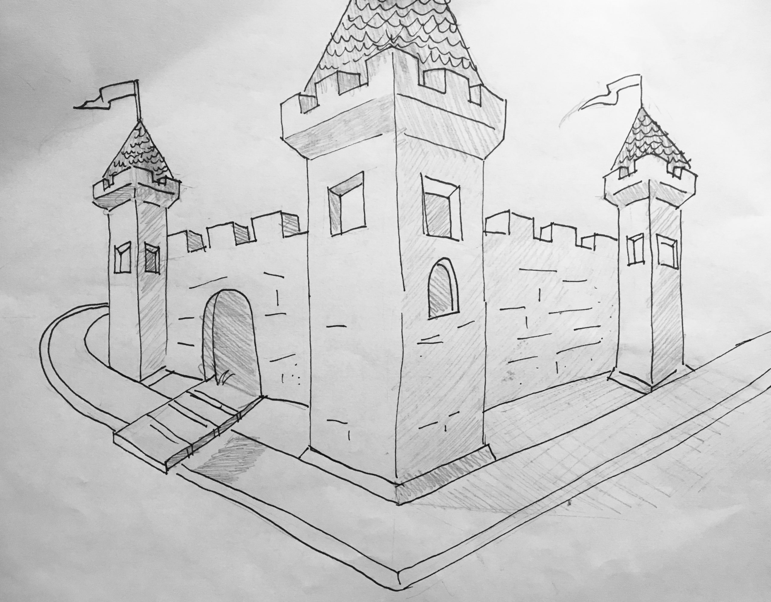 Sam Kuang (16), Castle Published September 12, 2020 at 2560 × 1997 in Gallery Room 3: “Only Zombies Race to Mass Extinction!” A castle drawing made after following a tutorial for 8th graders. Artist: Sam Kuang (16) Size: 8.5″ x 11″ Medium: Pen Date: July 2020 Title: Castle Retail value: NFS