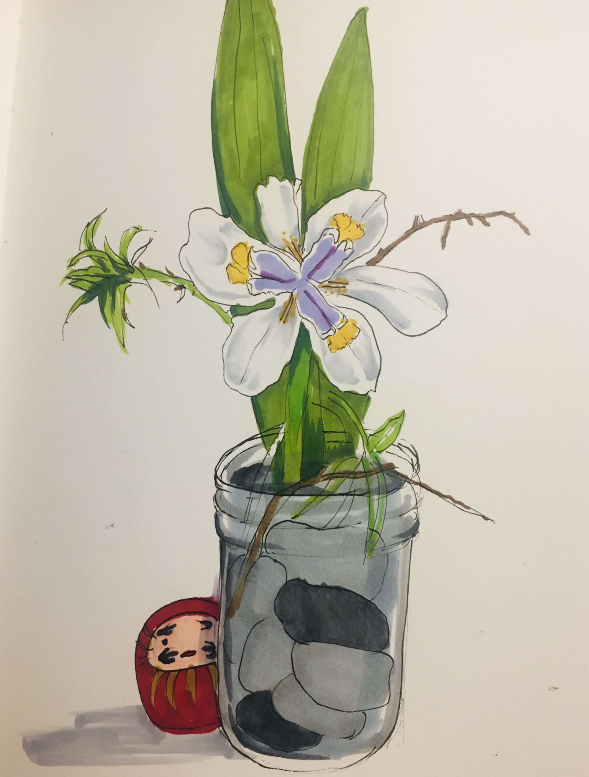 Ikebana with a daruma on the side. The ikebana has a white lily with accents of purple and yellow.