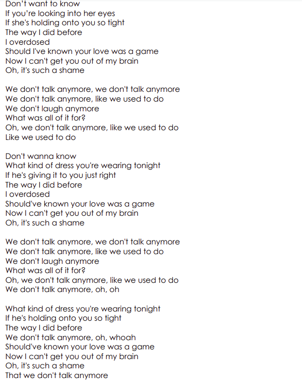 Published October 11, 2020 at 622 × 782 in Gallery Room 3: “Only Zombies Race to Mass Extinction!” Charlie Puth, “We Don’t Talk Anymore” Original Song Lyrics 2