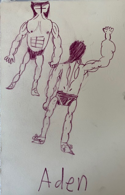 Aden P. (8), “Wrestlers” Published September 2, 2020 at 409 × 640 in Gallery Room 4: Afterschool Lessons and Artist Trading Cards Artist’s name: Aden P. (8) Size: 7.5″x11″ Medium: Marker Date: 2019 Title of work: “Wrestlers” Retail value: Inquire