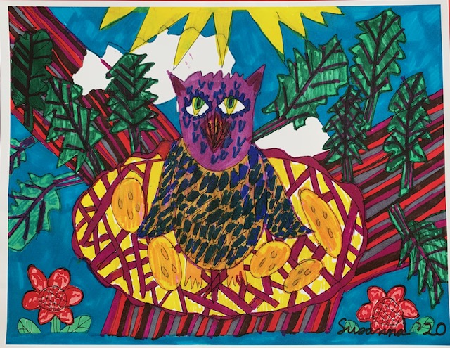 Susanna Kohn Published September 20, 2020 at 640 × 495 in Gallery Room 5: Featured Artists’ Works – Michelle Vignes and More! Artist: Susanna Kohn Size: 8.5″ x 11″ Medium: Color photocopy of pencil and markers on paper Date: 08/2018 Title: Owl Sitting on a Nest with Eggs in an Oak Tree with Leaves against Cloudy Sky and Sun Retail value: NFS