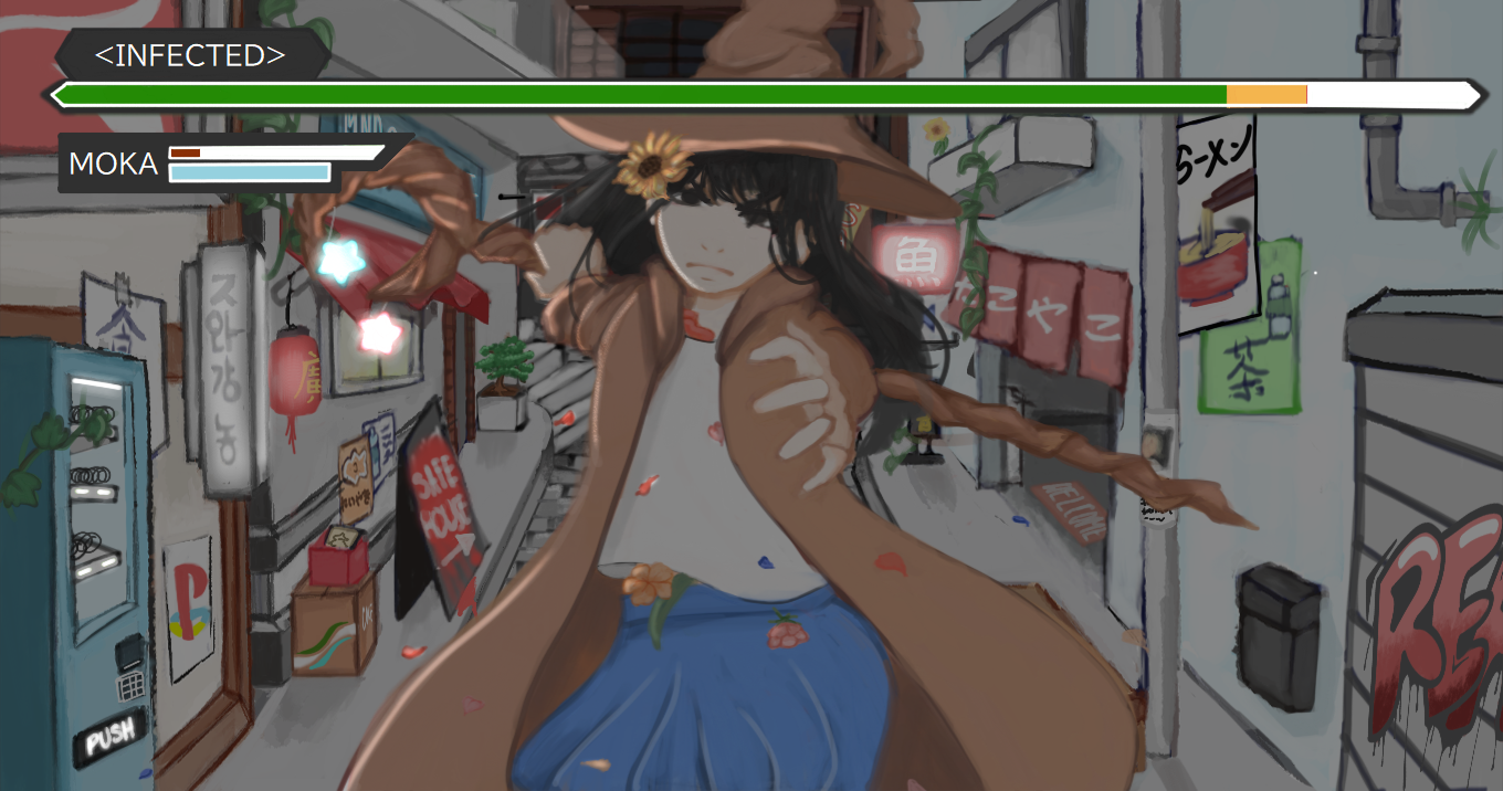 In the dead of night, a witch is ready to attack as petals float around her
