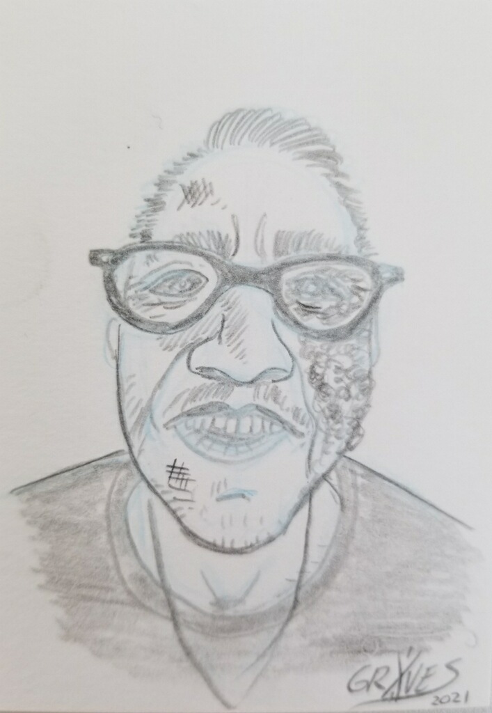 Thomas Graves, Pat as a Zombie Published July 29, 2021 at 707 × 1024 in Gallery Room 2: 2021 “New Normal: Learning From the Past to Move Forward Together” Artist: Tom Graves Size: 2.5″ x 3″ Medium: Pencil Date: July 2021 Title: Pat as a Zombie Retail value: NFS