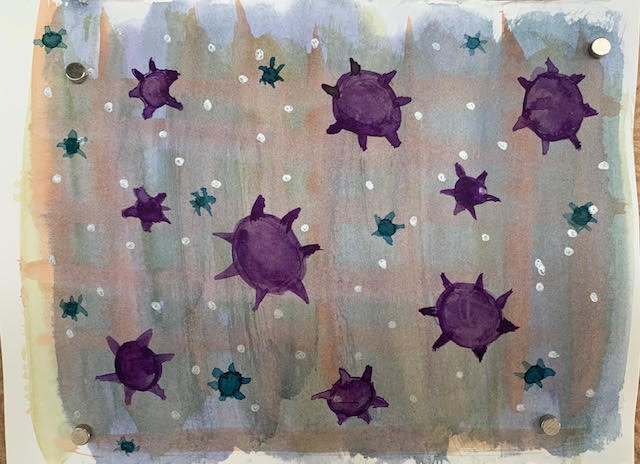 Sabine Gysens, COVID Doodle #6 Published November 24, 2021 at 640 × 464 in Gallery Room 2: 2021 “New Normal: Learning From the Past to Move Forward Together” Artist: Sabine Gysens Size: 6 x 8″ Medium: Watercolor and Gel Pen Date: June 12 2020 Title: Virus Series #5 Retail value: $75
