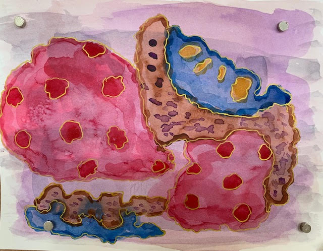 Sabine Gysens, COVID Doodle #7 Published November 24, 2021 at 640 × 498 in Gallery Room 2: 2021 “New Normal: Learning From the Past to Move Forward Together” Artist: Sabine Gysens Size: 6 x 8″ Medium: Watercolor and Gel Pen Date: June 4 2020 Title: Virus Series #4 Retail value: $75